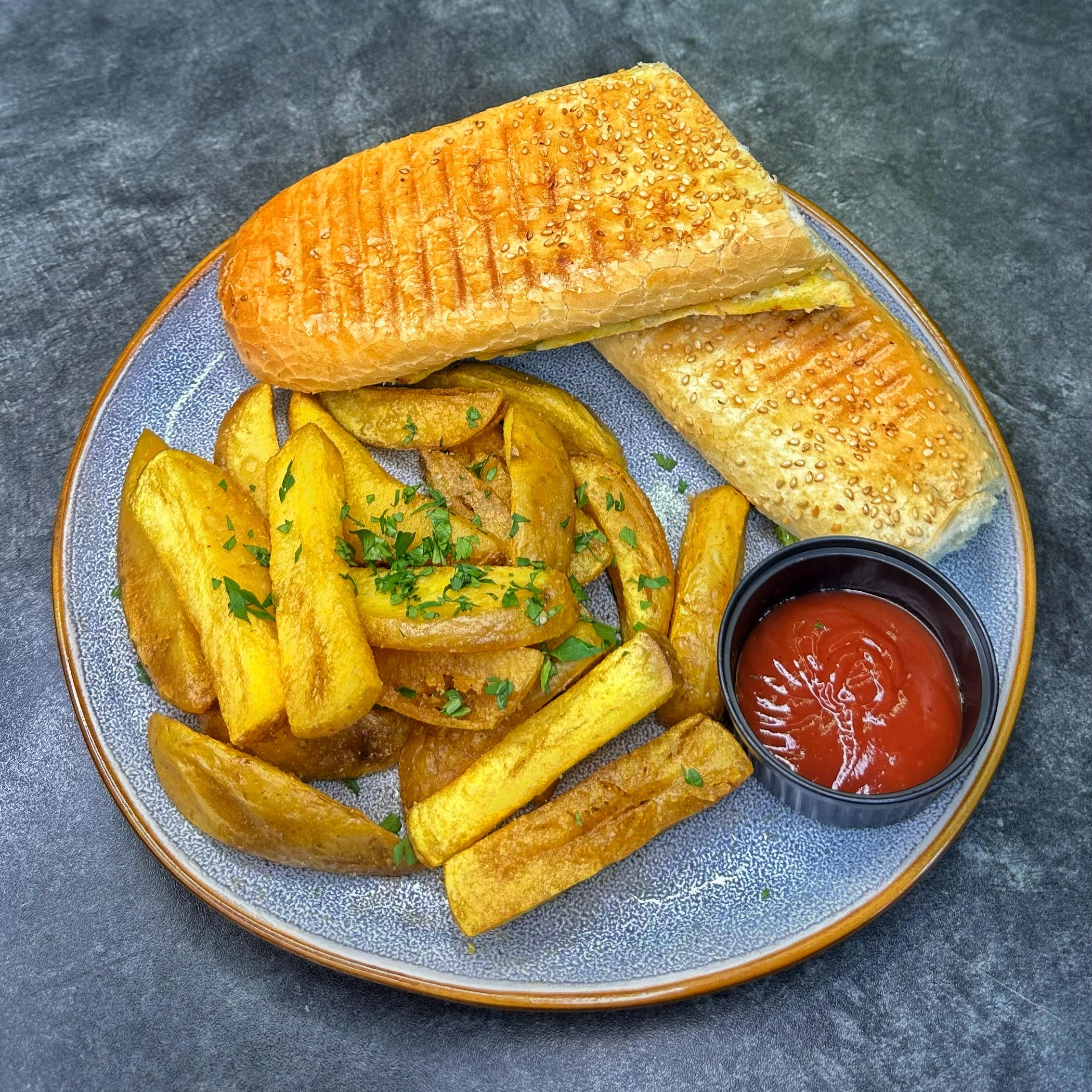 گوشت راسته گوساله، قارچ، فلفل دلمه، پیاز کاراملی، پنیر به همراه سیب زمینی